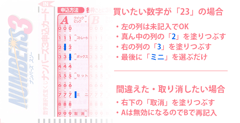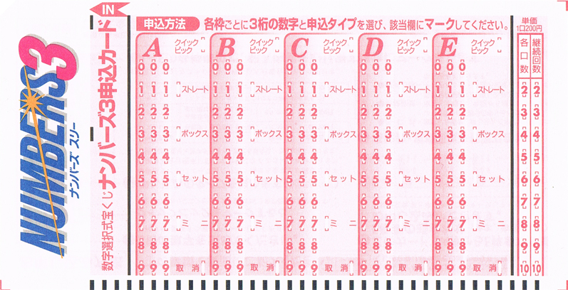 まずは「ナンバーズ3」のマークシートを1枚手に取りましょう。