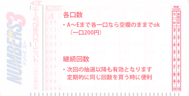 マークシート一番右の枠「各口数」で、一つの数字に対し、2口~10口まで選択することができます。